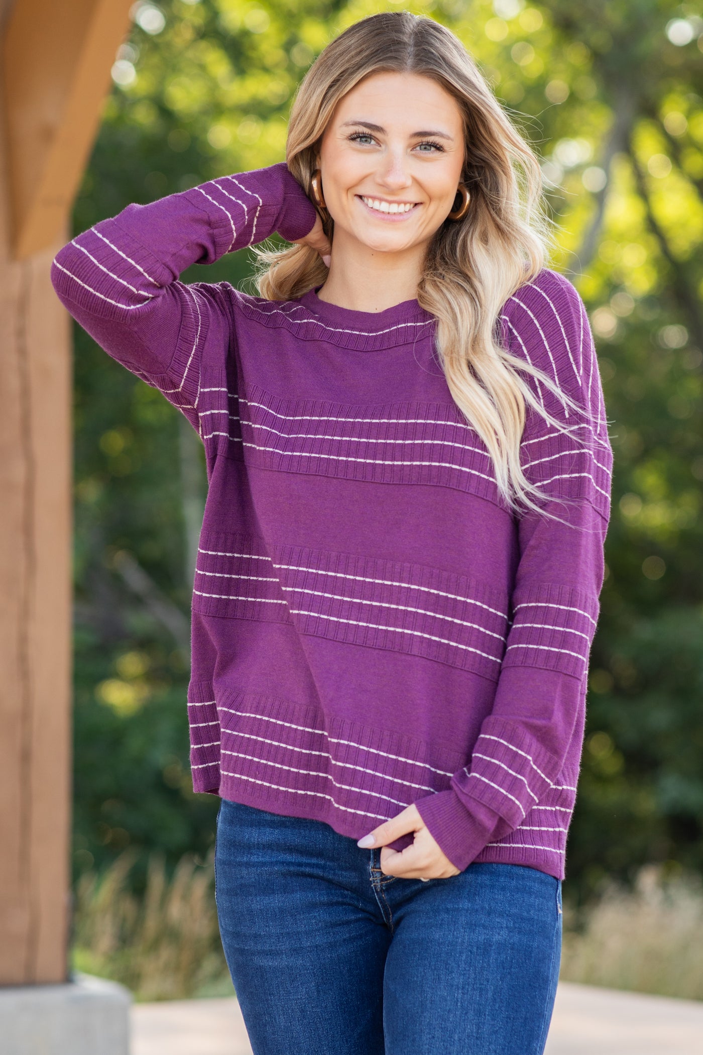 This is super comfy sweater; good stretch and not boxy. Soft material. The purple is a beautiful fall shade of purple. Would highly recommend as an add to your wardrobe! It is TTS, and for me, it isn’t long enough for tights…it hit exactly where the pictures showed.
