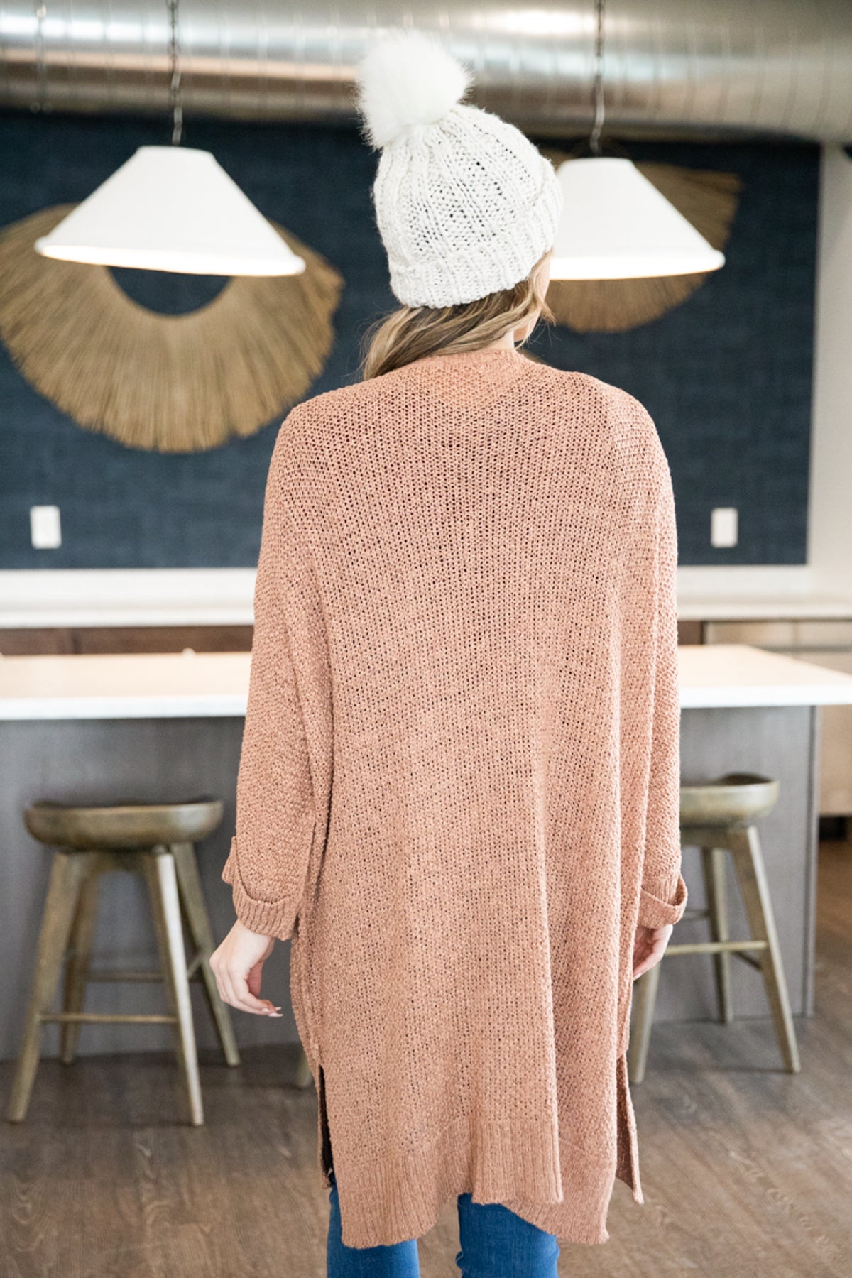 Tan Open Knit Tab Sleeve Long Cardigan