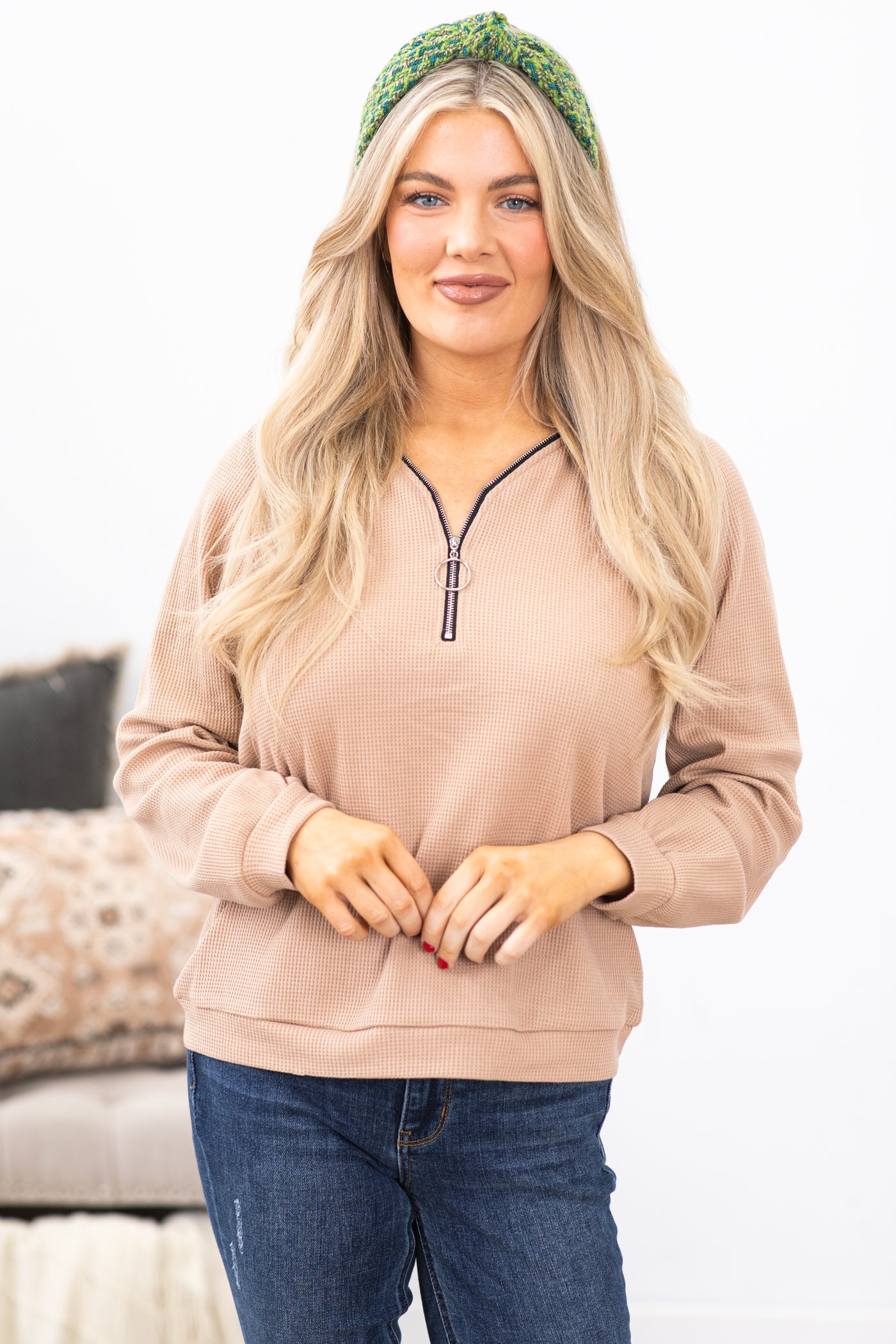 Tan Waffle Knit Half Zip Top