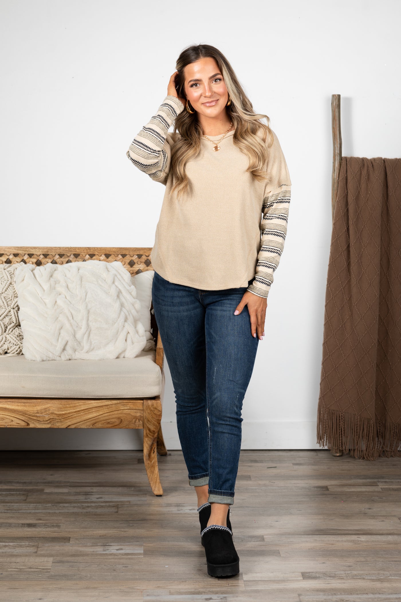 Taupe Contrast Striped Sleeve Detail Knit Top