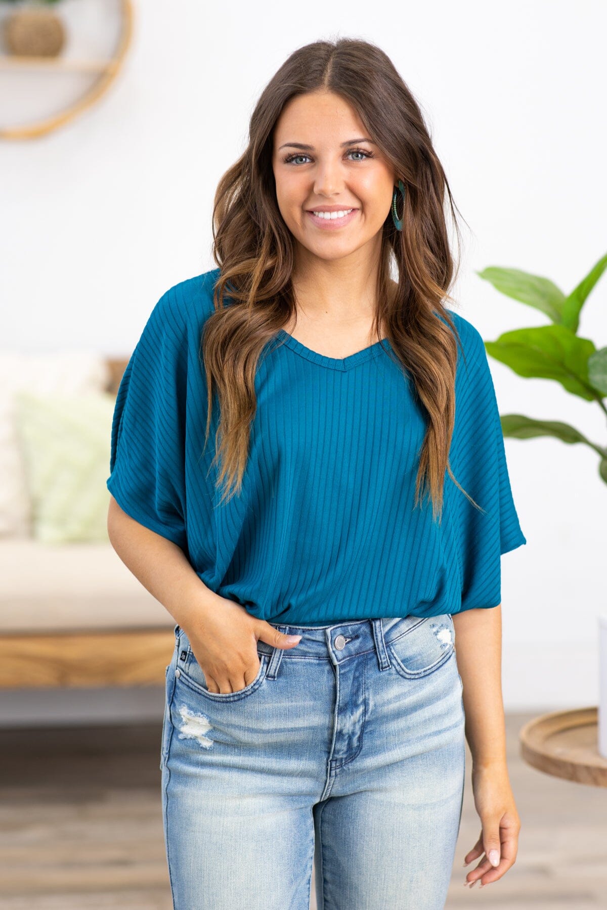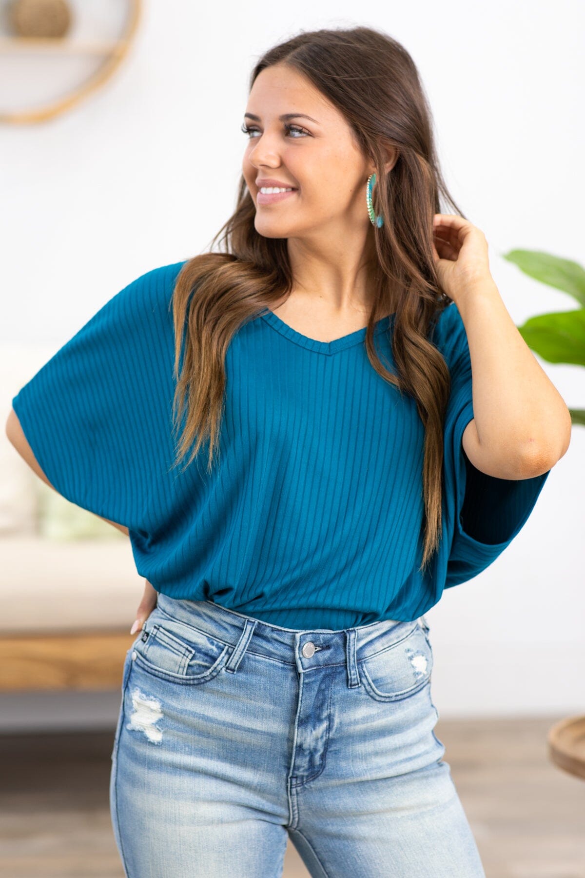 Teal V-Neck Dolman Sleeve Back Cutout Top