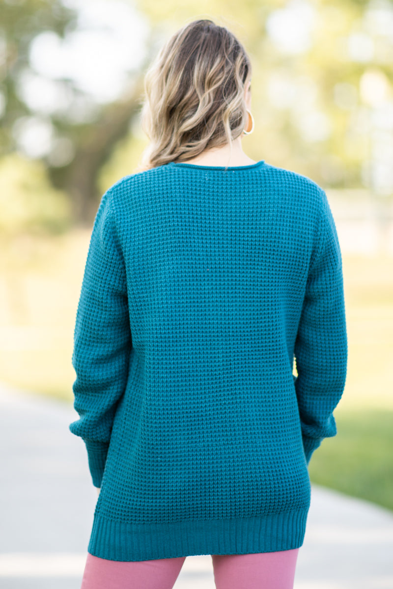 Teal Waffle Knit Cardigan With Pockets