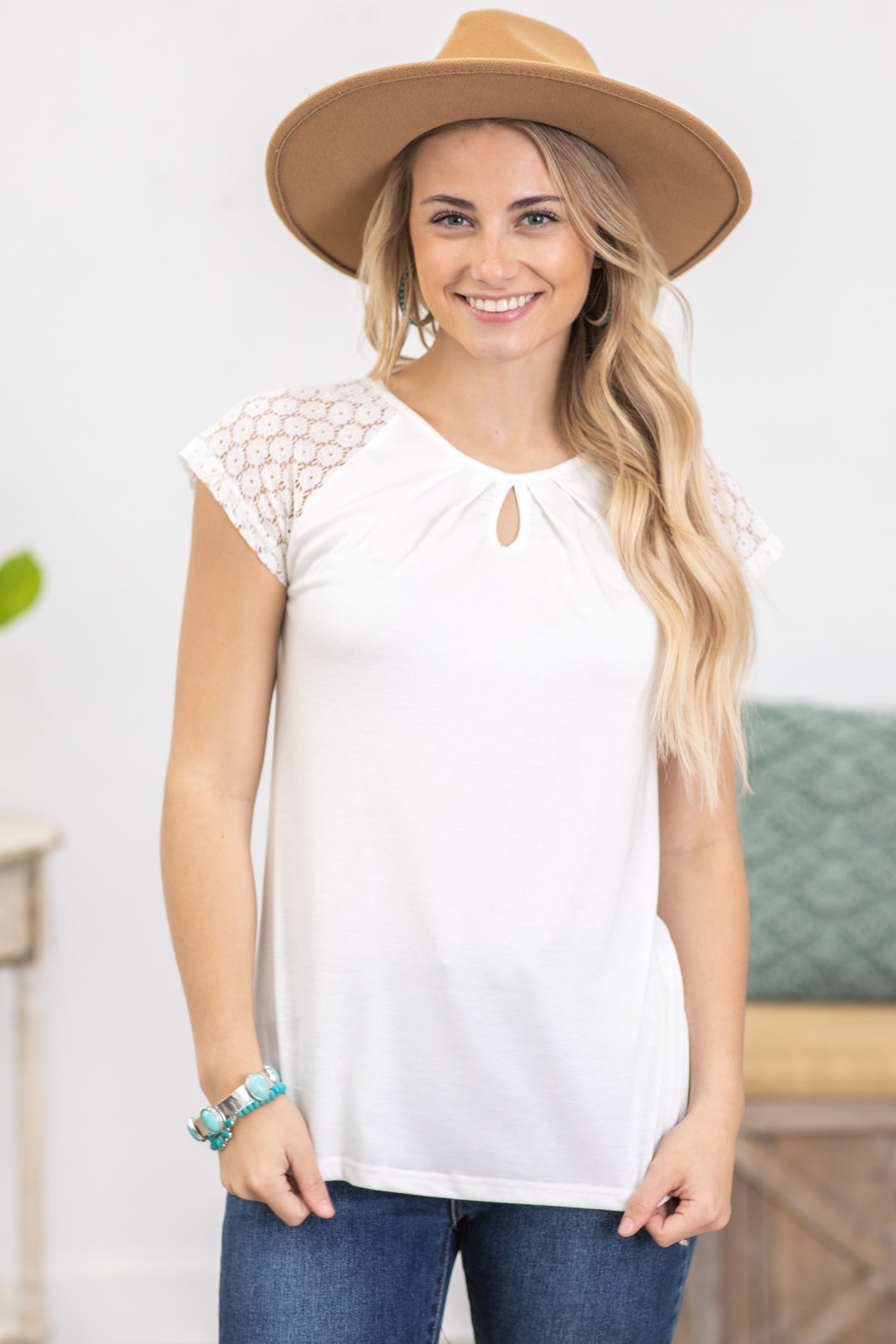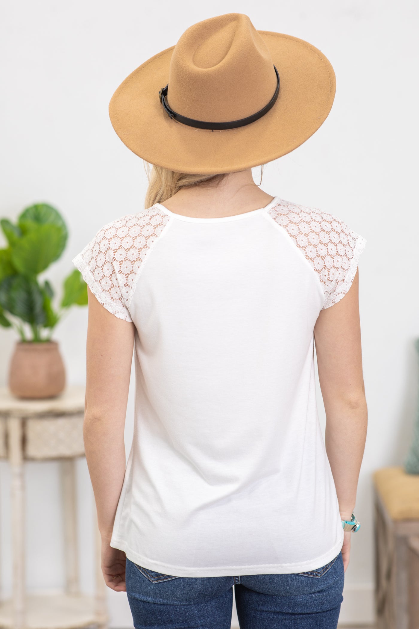 White Contrast Lace Sleeve Knit Top
