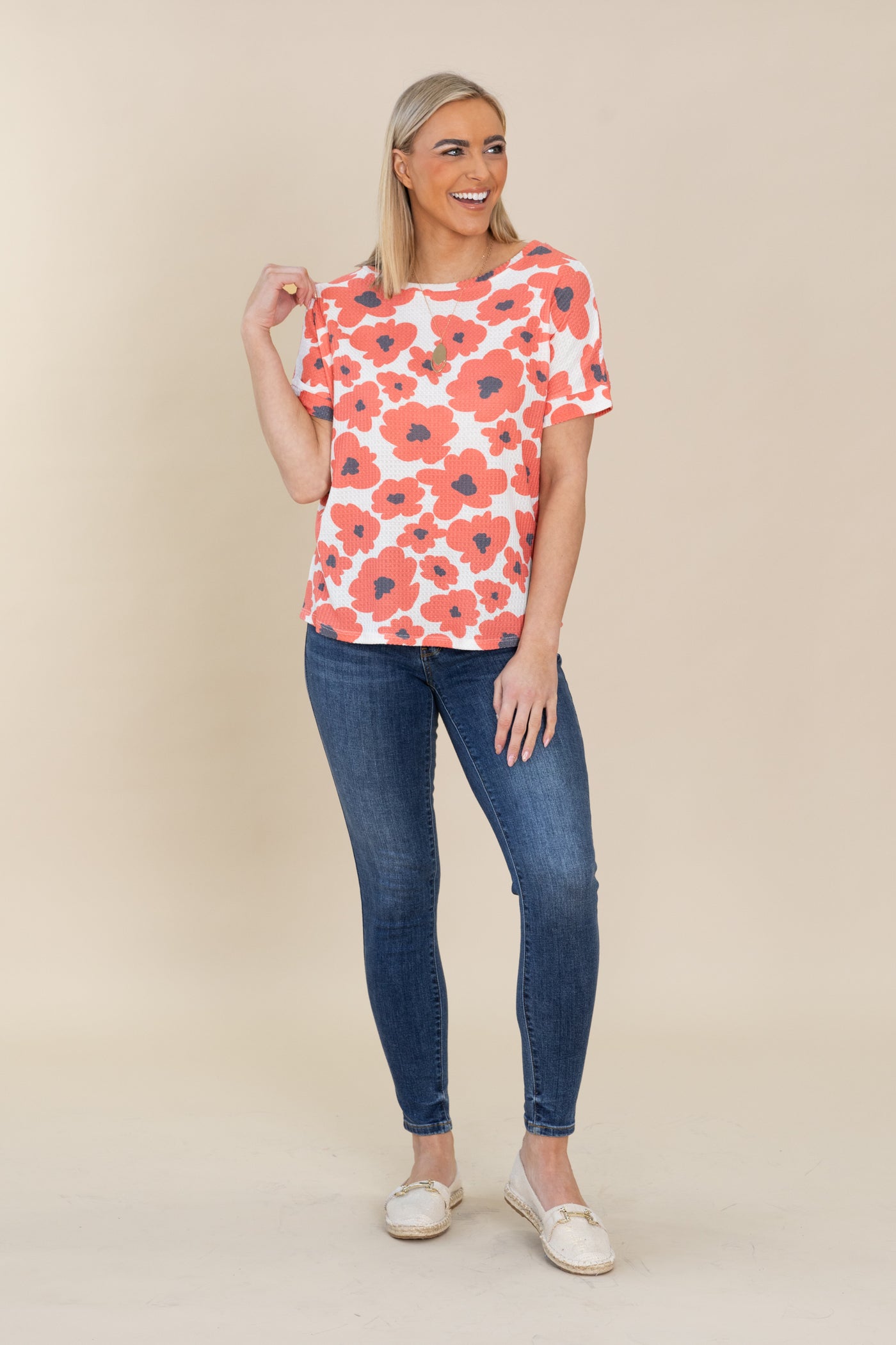 White With Coral Floral Print Waffle Knit Top