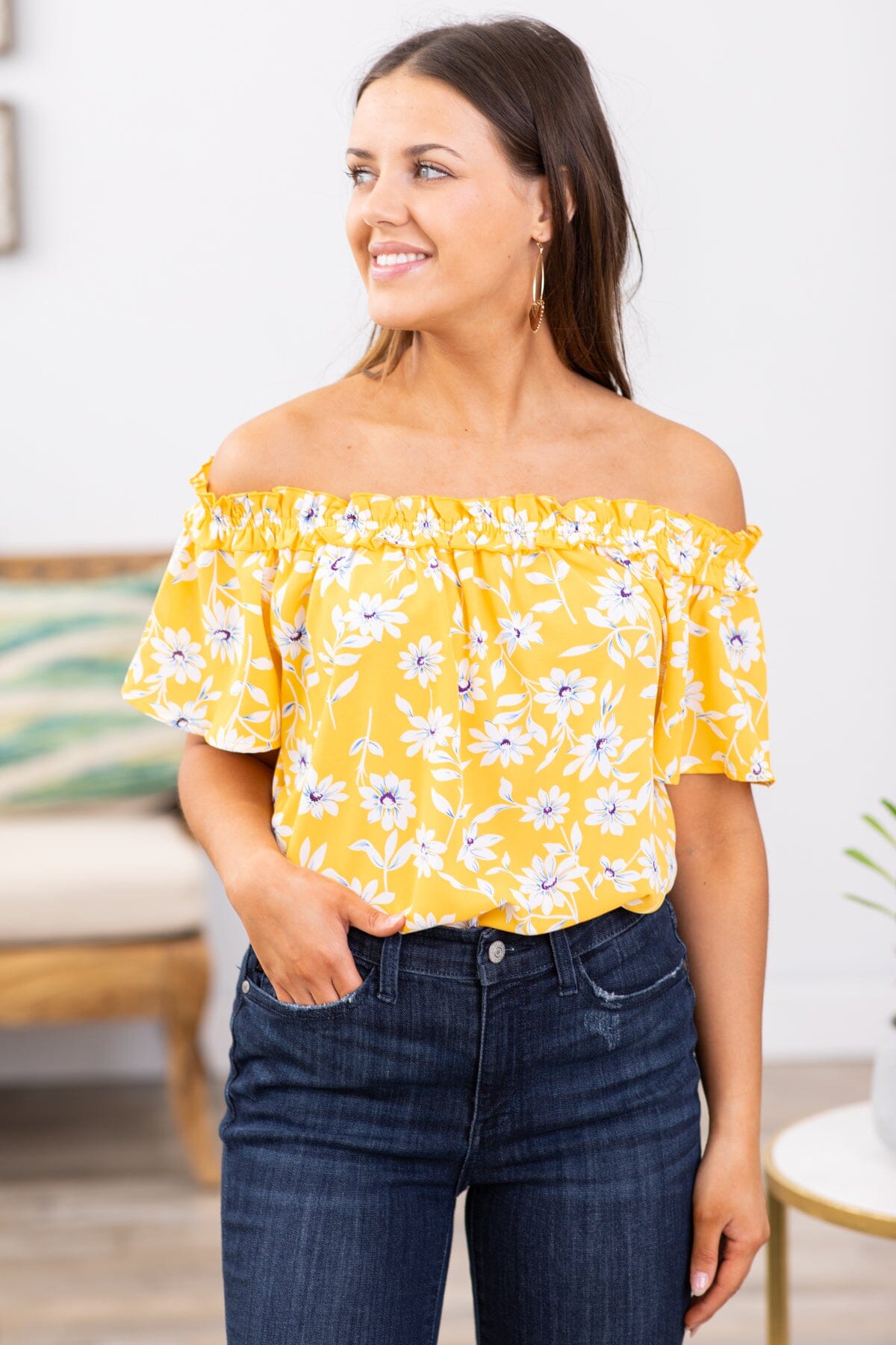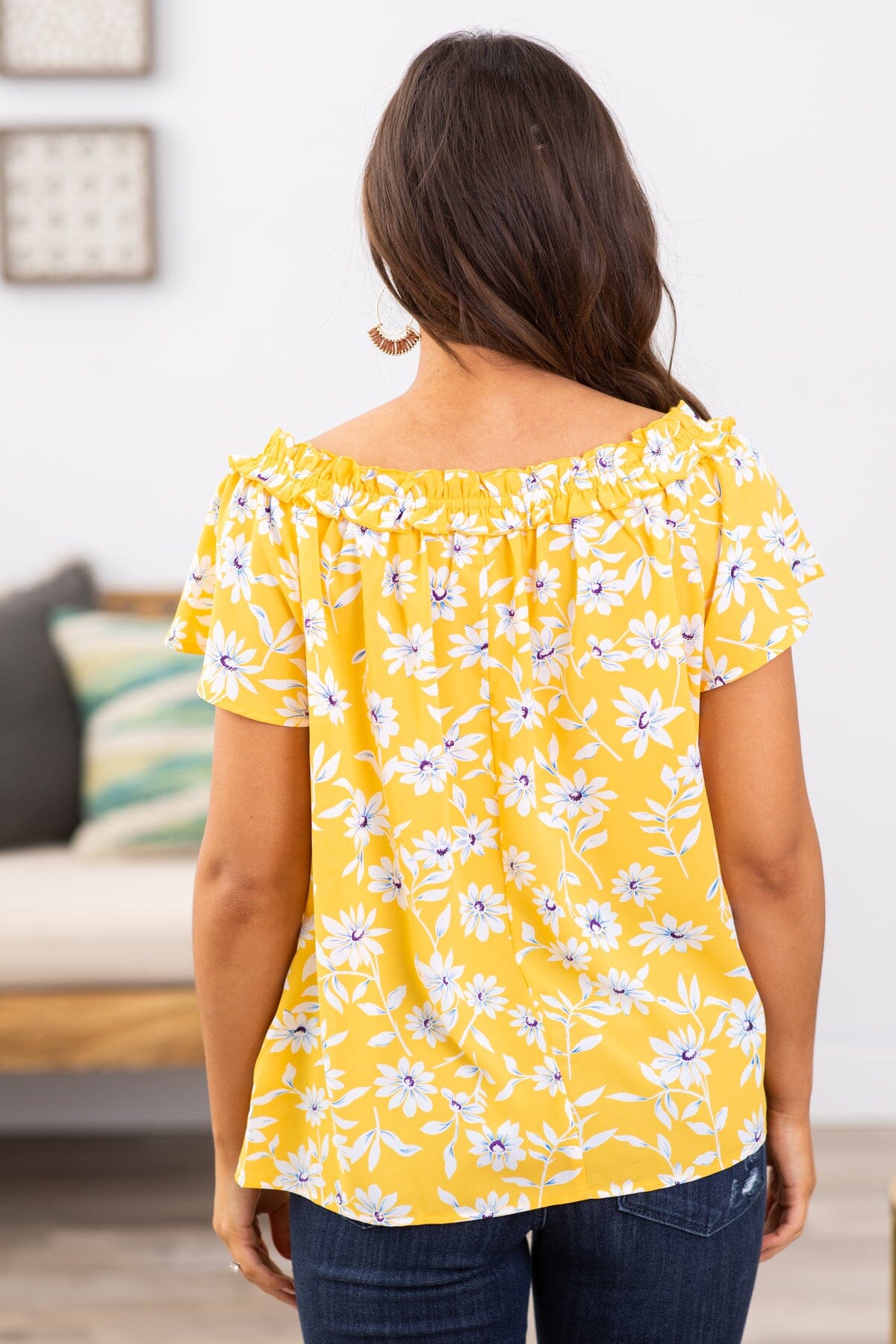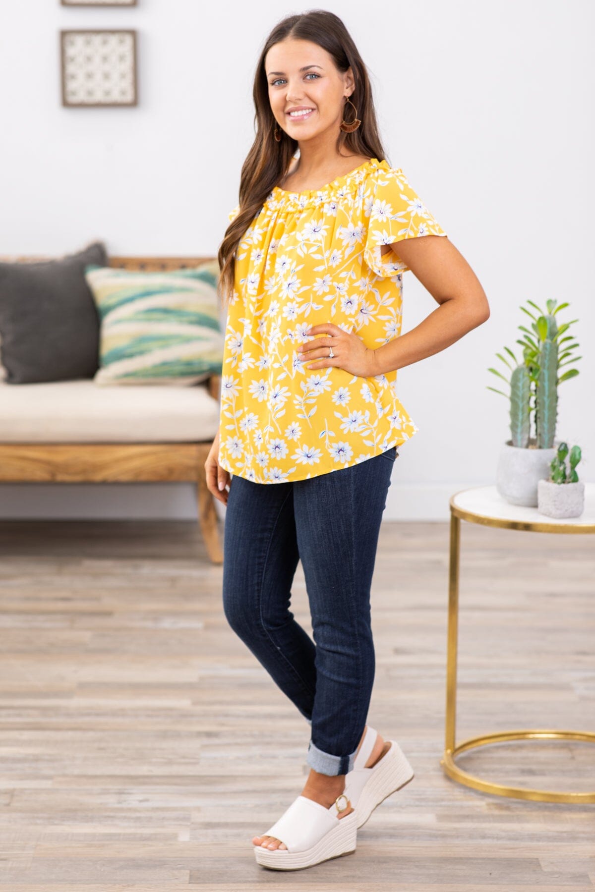 Yellow and Blue Floral Smocked Trim Top