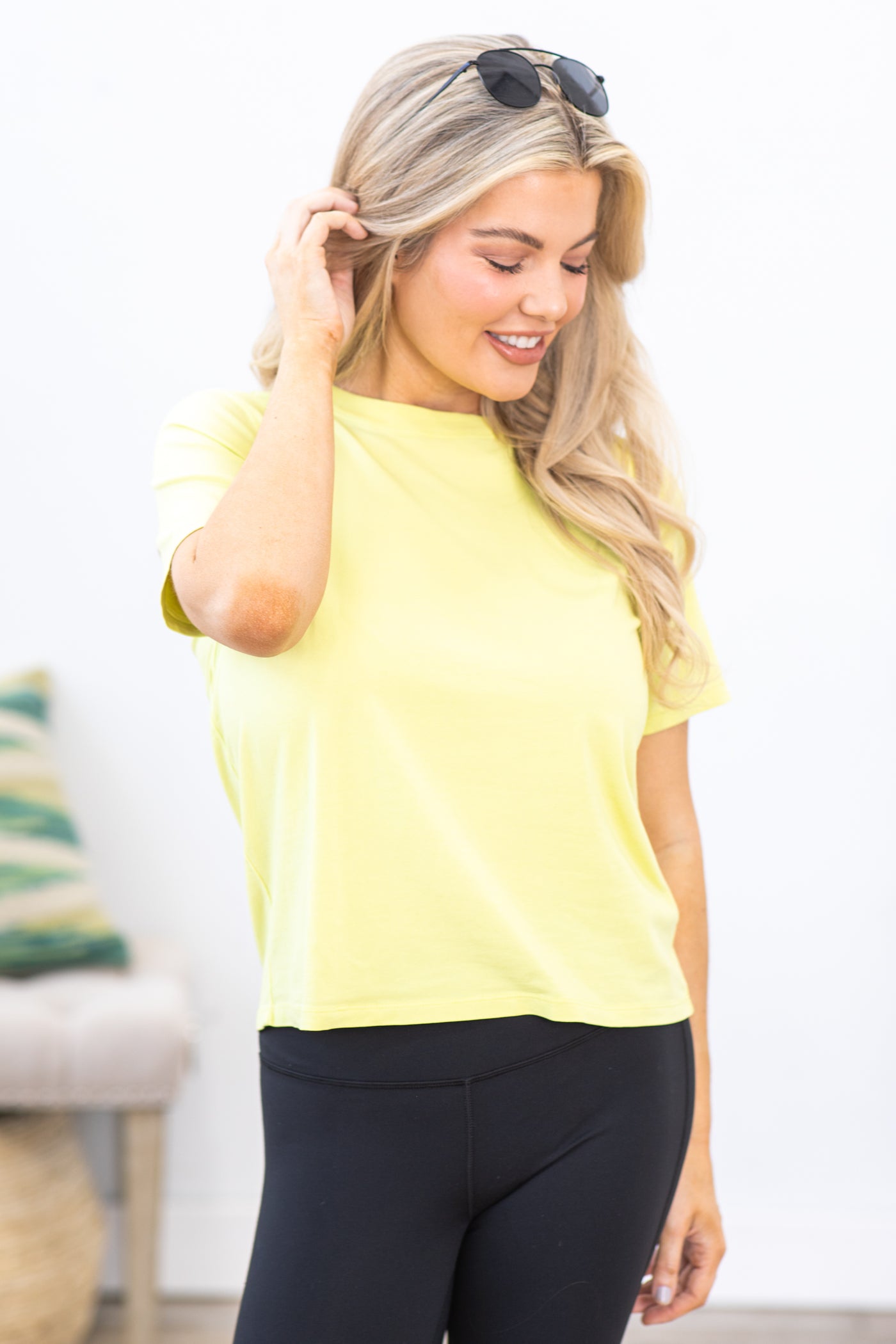 This tops color looks really nice on here & the video too but that's it. I was disappointed with the color because it looks like a dingy dirty yellow. It looks as if it's been washed with very dark clothing and stained the top. You know. I guess I'll use it to wear while cleaning, painting, spring cleaning. I'm so glad I didn't jump the gun and buy one of each color like I started to